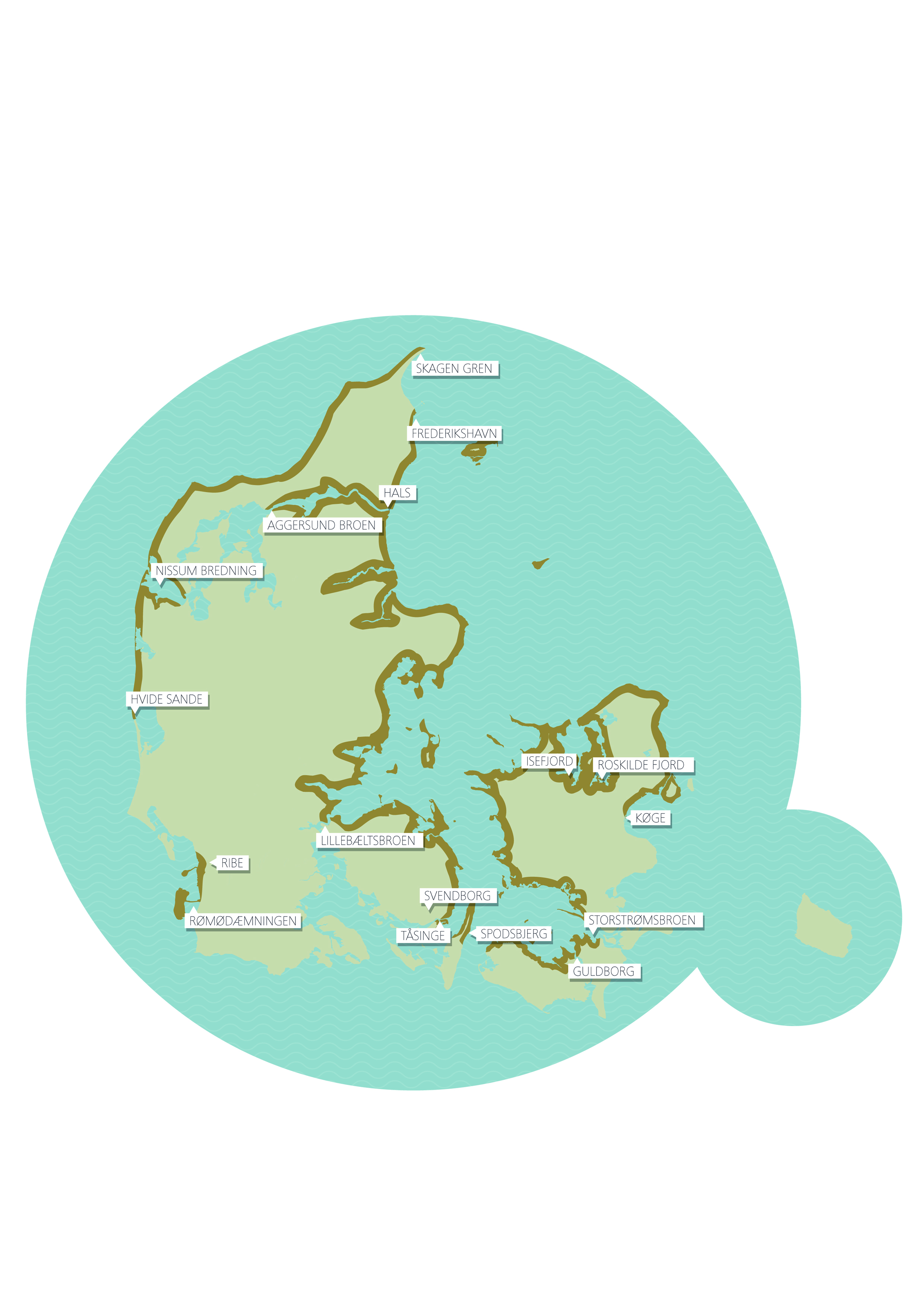 - Fra Køge nord om Sjælland til Storstrømsbroen, inkl. Roskilde Fjord og Isefjord.